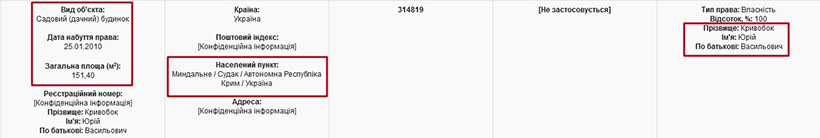 Один из них расположен в селе Миндальное недалеко от Судака и черноморского побережья. Юрий Кривобок приобрел этот дом, площадью 151 м², в 2010 году. Указанная стоимость дома 314 тысяч гривен - на то время это около 40 тысяч долларов.
