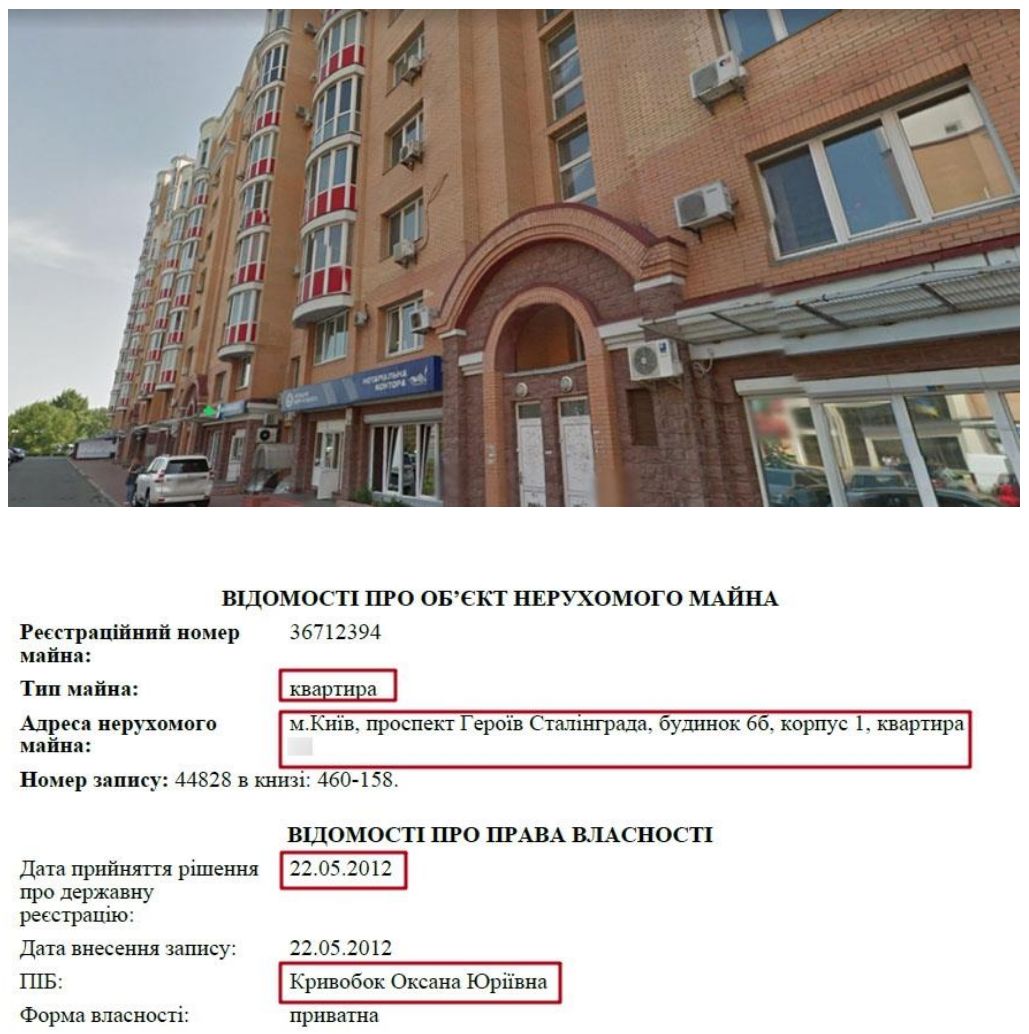 В декларации 2015 года Кривобок указал, что в собственности его жены находится 3 квартиры в селе Софиевская Борщаговка. Именно на месте этих квартир в 2009-2010 годы, когда он работал прокурором Оболонского района Киева, его родители и жена получили в собственность 16 гектаров земли.