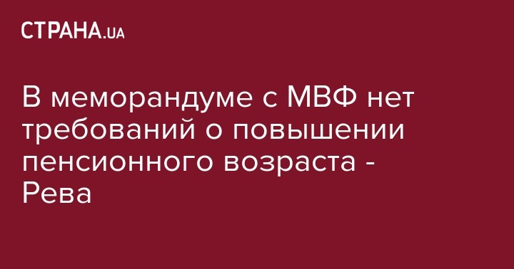 "На сегодняшний день этого (повышения пенсионного возраста, - ред.) нет в программе сотрудничества с МВФ. Сейчас будет подписан меморандум и этого положения в меморандуме нет. Потому что мы четко объяснили МВФ, что мы будем делать для стабилизации пенсионного фонда", - заявил Андрей Рева в телеэфире.