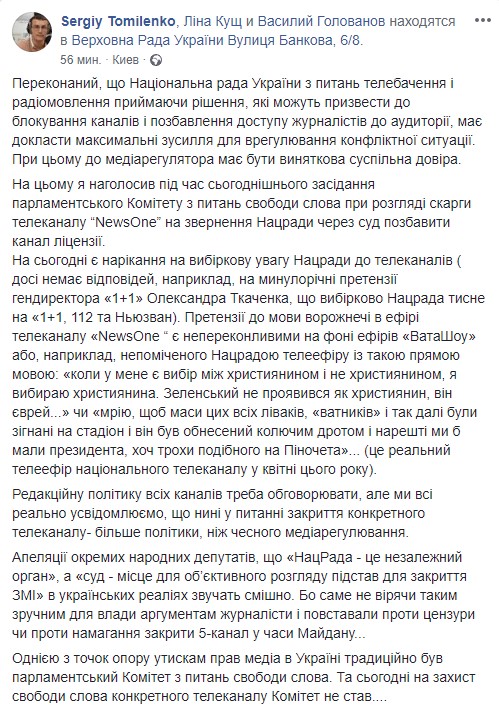 "Сегодня есть нарекания на выборочное внимание Нацсовета к телеканалам. Претензии к языку вражды в эфире телеканала "NewsOne “ являются неубедительными на фоне эфиров "ВатаШоу" или, например, незамеченного Нацсоветом телеэфира с такой прямой речью: "когда у меня есть выбор между христианином и не христианином, я выбираю христианина. Зеленский не проявился как христианин, он еврей...", "мечтаю ли, чтобы массы этих всех леваков, "ватников" и так далее были согнаны на стадион и он был обнесен колючей проволокой и наконец мы бы имели президента, хоть немного похожего на Пиночета"... (это реальный телеэфир национального телеканала в апреле этого года)", - написал Томиленко.
