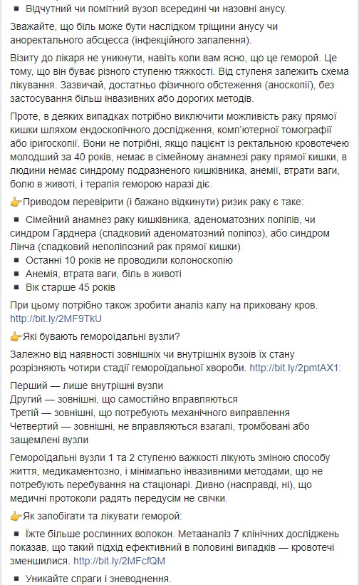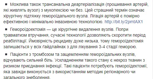 "Учитывайте, что боль может быть следствием трещины ануса или аноректального абсцесса (инфекционного воспаления). Визита к врачу не избежать, даже когда вам ясно, что это геморрой. Это потому, что он бывает разной степени тяжести. От степени зависит схема лечения. Обычно, достаточно физического обследования (аноскопии), без применения более инвазивных или дорогостоящих методов", - отмечает Супрун.