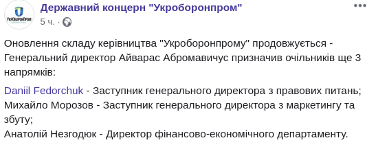 "Генеральный директор Айварас Абромавичус назначил руководителей еще трех направлений: Даниил Федорчук - заместитель генерального директора по правовым вопросам; Михаил Морозов - заместитель генерального директора по маркетингу и сбыту; Анатолий Незгодюк - директор финансово-экономического департамента ", - говорится в сообщении.