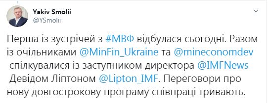 "Первая из встреч с МВФ состоялась сегодня (16 октября – Ред.). Вместе с руководителями Минфина и Миниэкономики общались с заместителем директора МВФ Дэвидом Липтоном", - написал Смолий.
