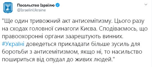"Еще один тревожный акт антисемитизма. На этот раз на лестнице главной синагоги Киева. Надеемся, что правоохранительные органы арестуют виновных. Украине придется прикладывать больше усилий для борьбы с антисемитизмом, если нет, то насилие распространится от чучел к живым людям", - говорится в сообщении.