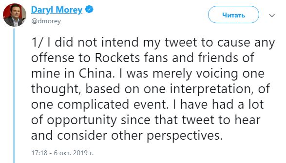 Сам генеральный менеджер "Рокетс" уже принес свои извинения: "Я не хотел, чтобы мой твит как-то обидел фанатов "Рокетс" и моих друзей из Китая. Я едва высказал одну мысль, основанную на одной интерпретации одного запутанного события. После публикации того твита у меня было много возможностей услышать и оценить другие точки зрения", — написал Дэрил Моли в Twitter.