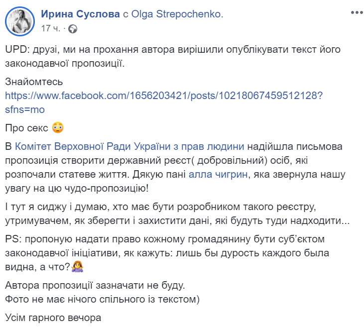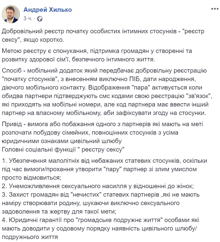 В Украине предложили создать добровольный т.н. "реестр секса", в котором хотят фиксировать начало личных интимных отношений. Об этом говорится на фб-странице адвоката Андрея Хилько.