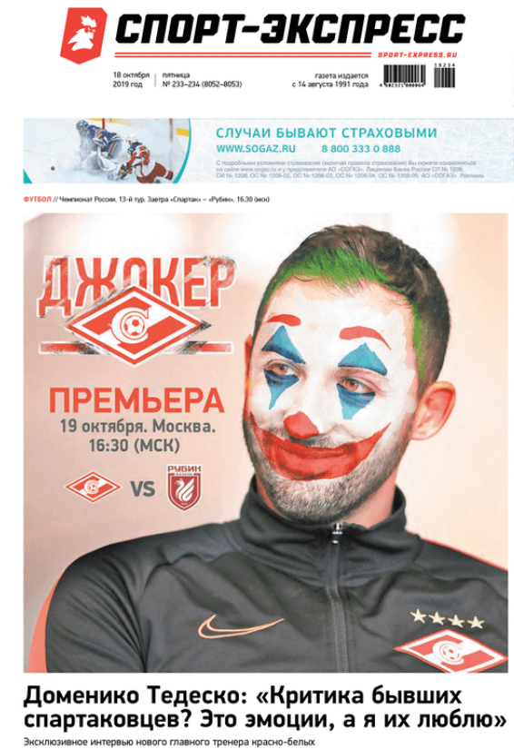 Сегодня, 18 октября, "СЭ" дал интервью с новым главным тренером московского Спартака Доменико Тедеско. И все бы ничего, если бы его не вынесли на обложку в образе Джокера (фильм про которого сейчас бьет все рекорды - Ред.).