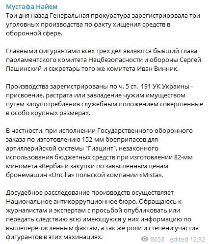 Главными фигурантами трех уголовных производств о хищении средств в оборонной сфере, которые Генеральная прокуратура зарегистрировала 15 октября, являются бывший глава парламентского комитета Нацбезопасности и обороны Сергей Пашинский и секретарь того же комитета Иван Винник. Об этом в Telegram-канале сообщил экс-нардеп Мустафа Найем.