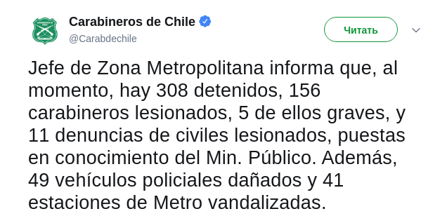 Не менее 160 человек пострадали в ходе протестов в чилийской столице. Среди пострадавших были 156 стражей порядка. Об этом сообщила в субботу полиция республики в Twitter.