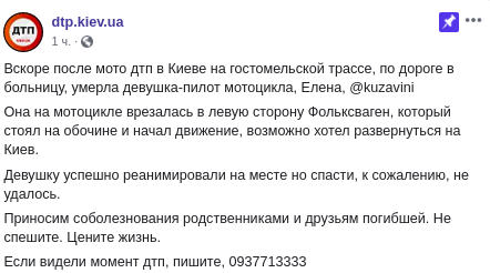 Девушка Елена под ником @kuzavini на мотоцикле врезалась в левую сторону авто "Фольксваген", который стоял на обочине и начал движение. Девушку успешно реанимировали на месте, но спасти, к сожалению, не удалось.