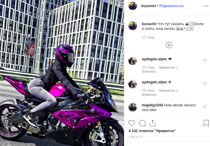 У девушки на странице почти 1 300 публикаций и 72 тысячи подписчиков. Большая часть постов сопровождалась фотографиями модели с мотоциклами. Она регулярно писала, как любит свой байк и что снова ждет сезона, чтобы кататься. У девушки нет фотографий с молодым человеком, но есть фото с мопсом, который, вероятно, остался один после смерти хозяйки.
