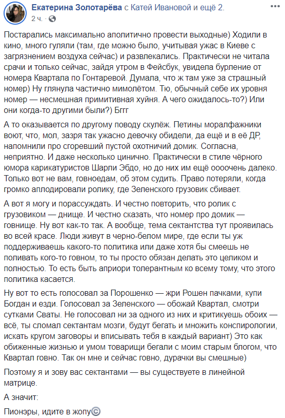 "Петины моралфажники воют, что, мол, зазря так ужасно девочку обидели, да ещё и в её ДР, напомнили про сгоревший пустой охотничий домик. Согласна, неприятно. И даже несколько цинично. Практически в стиле чёрного юмора карикатуристов Шарли Эбдо, но до них им ещё оооочень далеко. Только вот не вам, говноедам, об этом судить. Право потеряли, когда громко аплодировали ролику, где Зеленского грузовик сбивает", - пишет в Facebook Екатерина Золотарева.