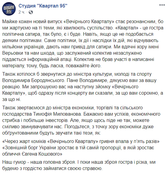 "В концерте "95 Квартала" мы впервые. Мы на Майдане с ними работали, на стадионе, где звучали проукраинские вещи. Мы столько позитива вносим во все проукраинское. Не только в государственных мероприятиях участвуем ... И, наконец, в этой песне ничего антиукраинского не было. Но это неприятный стеб над человеком. Я здесь согласен. Со всеми в этом согласен. Мы просто повелись. Я не подумал. Что здесь оправдываться? .. Это решение принимал я, а не коллектив", - отметил гендиректор.