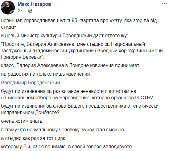 Журналист Макс Назаров интересует, а стыдно ли министру Бородянскому за оскорбления его предшественником жителей Донбасса.
