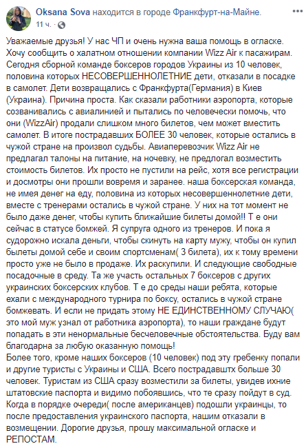 "Сборной команде боксеров городов Украины из 10 человек, половина которых несовершеннолетние дети, отказали в посадке в самолет. Дети возвращались из Франкфурта (Германия) в Киев (Украина). Причина проста. Как сказали работники аэропорта, которые созванивались с авиалинией и пытались по-человечески помочь, что они (WizzAir) продали слишком много билетов, чем может вместить самолет. В итоге пострадавших более 30 человек, которые остались в чужой стране на произвол судьбы", - написала в соцсети Оксана Сова.