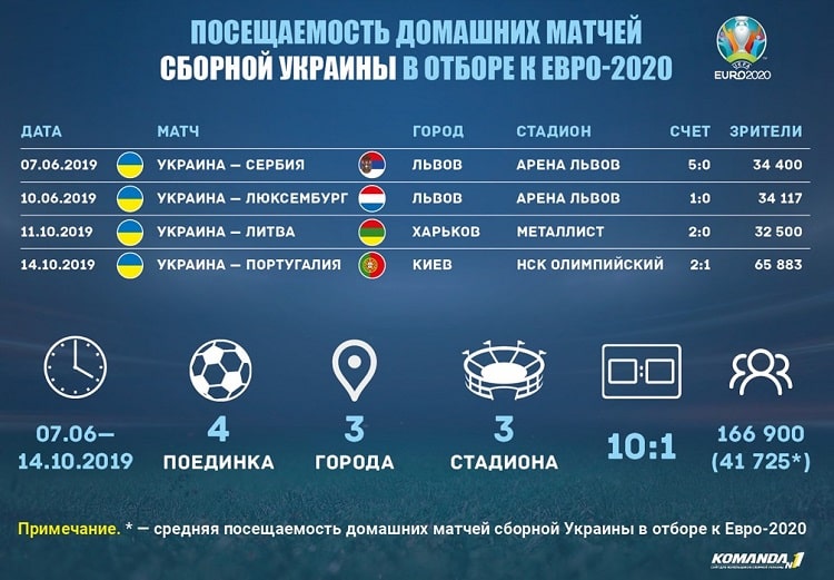 Сборная Украины в отборе на Евро-2020 провела в группе В восемь матчей, четыре из которых были домашними и прошли в трех городах Украины - два во Львове и по одному в Харькове и Киеве.