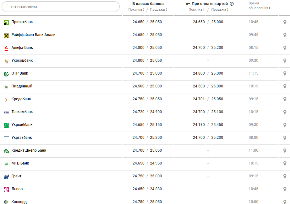 Курс Райффайзен Банк Аваль: 24,65 - покупка; 25,05 продажа.