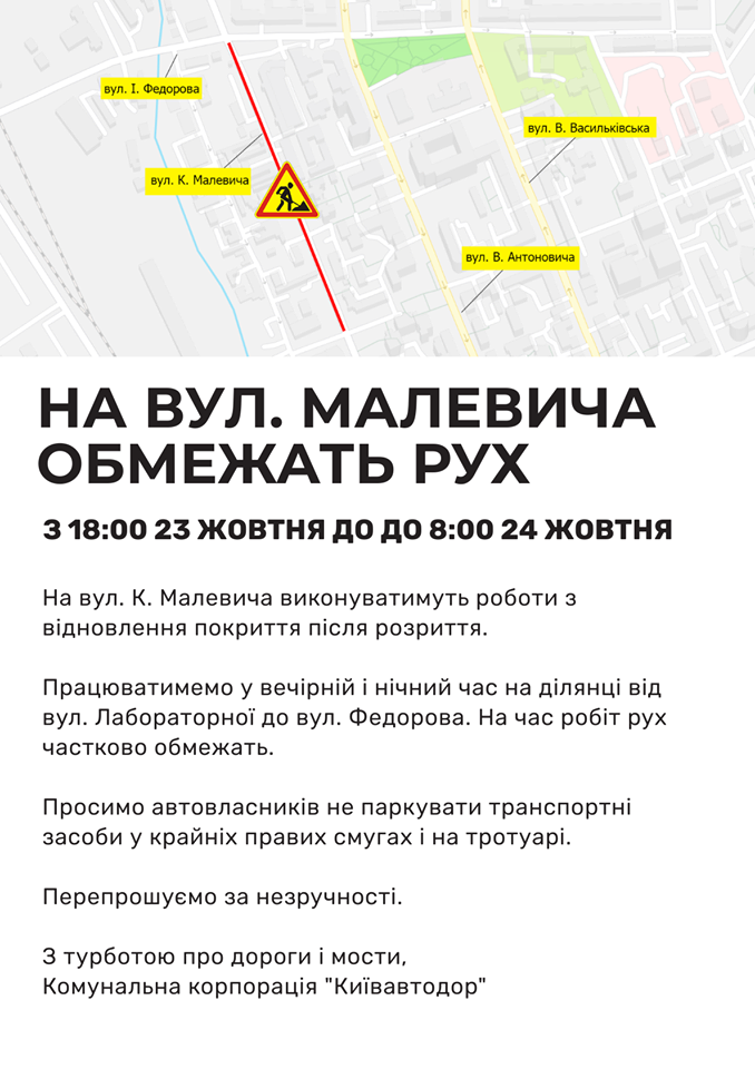 Сегодня, 23 октября, с 18.00 и до 08.00 четверга, 24 октября, дорожники ограничат движение на улице Малевича в Киеве в связи с восстановлением дорожного покрытия. Об этом сообщила пресс-служба "Киевавтодора".