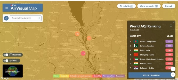 Возглавляют рейтинг самых загрязненных городов Дакка (Бангладеш) с показателем в 231 единицу, Лахор (Пакистан) - 203 и Дели (Индия) - 190.