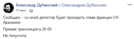 "Сообщаю, что со мной детектор будет проходить глава фракции "СН" Арахамия. Прямая трансляция в 20-00. Не пропустите", - говорится в сообщении.