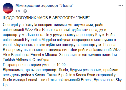 Уточняется, что не смог совершить посадку рейс авиакомпании Wizz Air из Вильнюса. В результате он смог сесть в румынском аэропорту Клуж. Рейс лоукостера Ryanair из Модлина ждал улучшения погодных условий в так называемой зоне ожидания и уже совершил посадку во Львове.
