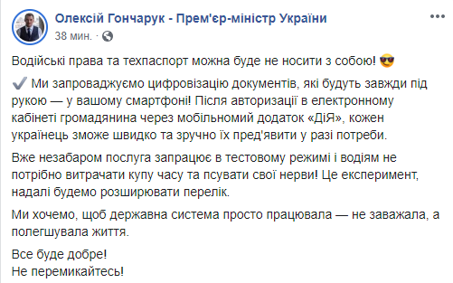 "Мы вводим цифровизацию документов, которые всегда под рукой - в вашем смартфоне! После авторизации в электронном кабинете гражданина через мобильное приложение "действие", каждый украинец сможет быстро и удобно их предъявить в случае необходимости", - говорится в сообщении.