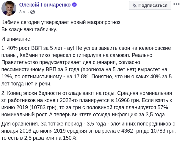 Рост ВВП Украины в ближайшие три года не будет выше, чем 4% в год. Об этом сказано в таблице обновленного макропрогноза Кабинета министров, опубликованной нардепом Алексеем Гончаренко на своей странице в Facebook в среду, 23 октября.