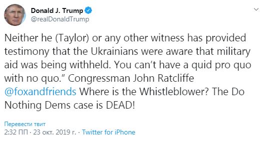 "Ни он (Тейлор – Ред.), ни какой-либо другой свидетель не дали показаний о том, что украинцы знали, что военная помощь была приостановлена. У вас не может быть "услуга за услугу" без услуги. Где Информатор? "Дело ничего не делающих Демократов" мертво!", - написал он.
