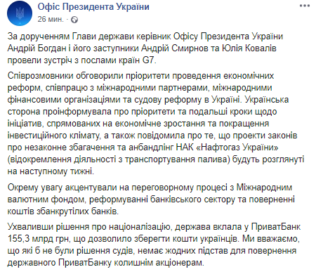 Несмотря на судебные решения, нет никаких оснований для того, чтобы Приватбанк вернулся вывшим акционерам. Об этом говорится в сообщении Офиса президента в Facebook по итогам встречи с послами стран "Большой семерки" (G7).