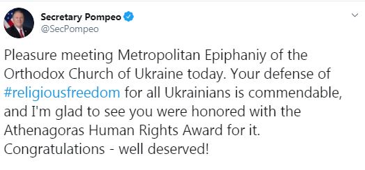 В своем Twitter Помпео заявил, что защита свободы вероисповедания для всех украинцев со стороны Епифания заслуживает похвалы. Также госсекретарь поздравил митрополита с получением награды "Athenagoras Human Rights Award".