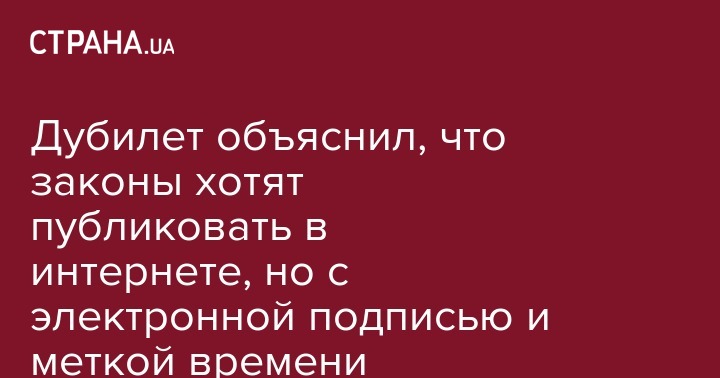 Министр Кабмина Дмитрий Дубилет пояснил, что если обязательную публикацию законов в "Урядовом курьере" и "Голосе Украины" отменят и их будут обнародовать на Едином веб-портале органов исполнительной власти, на них будет наложена электронно-цифровая подпись с меткой времени, поэтому изменить их не получится.