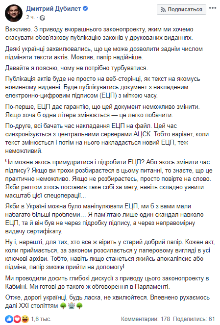 "По поводу вчерашнего законопроекта, которым мы хотим отменить обязательную публикацию законов в печатных изданиях. Некоторые украинцы заволновались, что это может позволить задним числом подменять тексты актов. Мол, бумага надежнее. Давайте я объясню, почему не нужно беспокоиться. Публикация актов будет не просто на веб-странице, как текст на каком-то новостном издании. Будет публиковаться документ с наложенной электронно-цифровой подписью (ЭЦП) с меткой времени", - написал он.