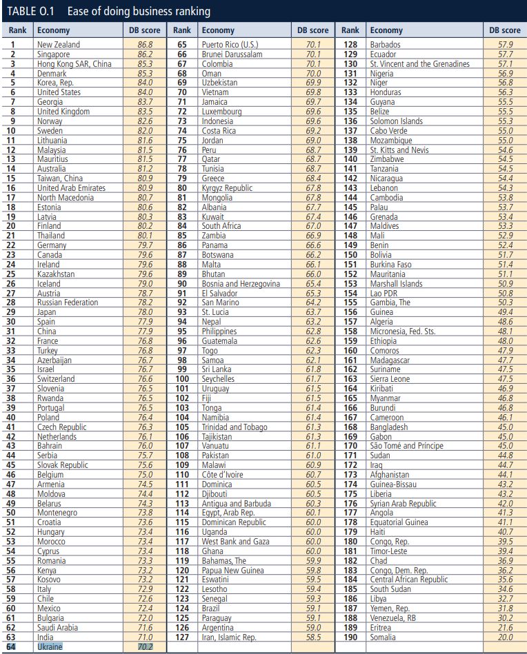 Всемирный банк опубликовал ежегодный рейтинг инвестиционной привлекательности стран мира Doing Business, в котором Украина поднялась сразу на 7 пунктов по сравнению с прошлогодним рейтингом. Она заняла заняла 64-е место среди 190 стран.