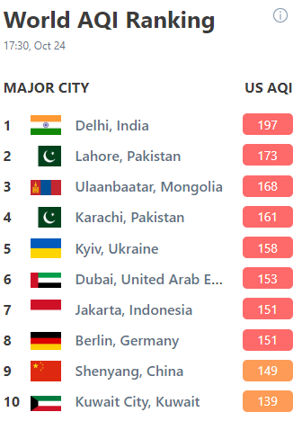 Ресурс AirVisual сообщает, что по состоянию на 17:00 24 октября индекс загрязнения воздуха в Киеве равен 158. То есть украинская столица оказалась на пятом месте загрязненных столиц, обогнав Джакарту, Мумбаи, Гуанчжоу. Хуже ситуация только в Дели, Лахоре, Улан-Баторе и Карачи.