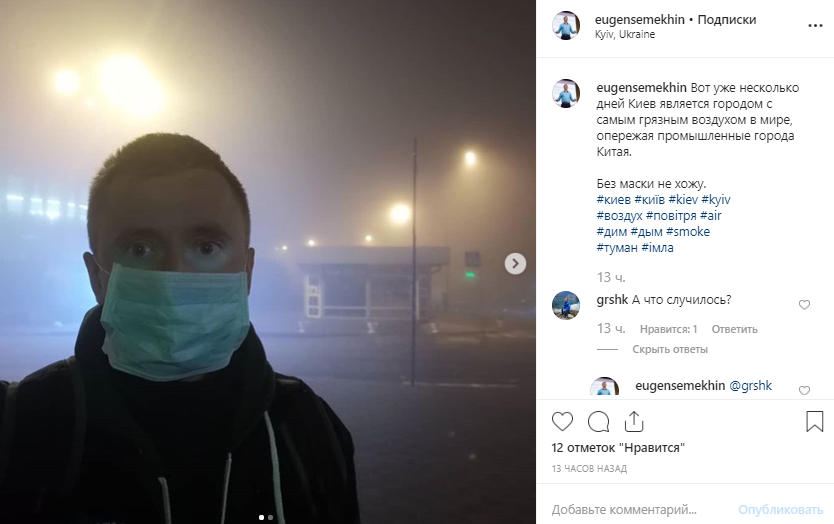 Украинцы спасаются медицинскими масками. "Вот уже несколько дней Киев является городом с самым грязным воздухом в мире, опережая промышленные города Китая. Без маски не хожу", - пишет Евгений Семехин в Instagram.