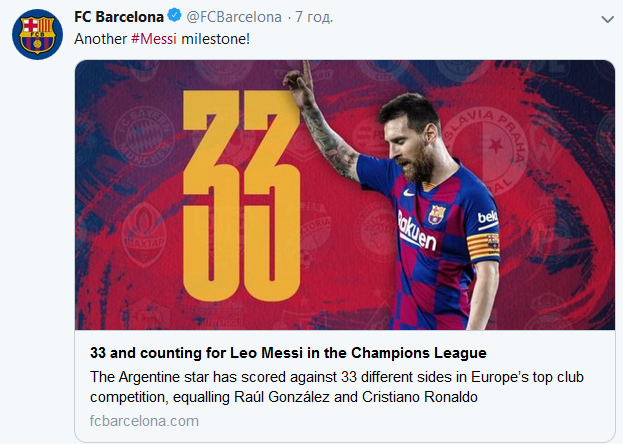 А вот гол Лео Месси стал не только его первым забитым мячом в этом сезоне Лиги чемпионов но и побил сразу два рекорда, как передает официальный Twitter клуба.
