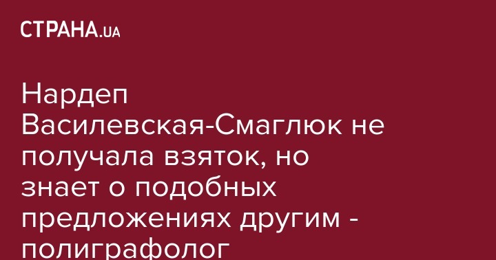 Согласно предварительным данным теста на полиграфе, нардеп от "Слуги народа", член парламентского комитета по вопросам финансов, налоговой и таможенной политики Ольга Василевская-Смаглюк не получала никаких взяток, но знает о подобных предложениях другим людям. Об этом журналистам после теста сообщила глава научно-методического совета Всеукраинской ассоциации полиграфологов Жаннетта Половникова.