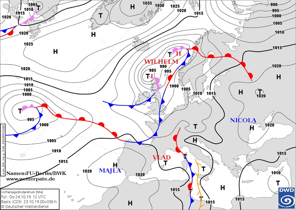 "Циклон Vlad вблизи Италии и циклон Wilhelm над северо-западом Европы обнялись, закрутили в прилегающих странах непогоду, отсекли и изолировали антициклональную полосу. В результате образовались антициклон Maja над Португалией и антициклон Nicola над Украиной, которые будут определять сухую и маловетреную погоду. А уже завтра эти антициклоны оттолкнут циклоны соответственно южнее и севернее, ухватятся за руки и снова над континентальной Европой воцарится полоса повышенного атмосферного давления", - написала Диденко.