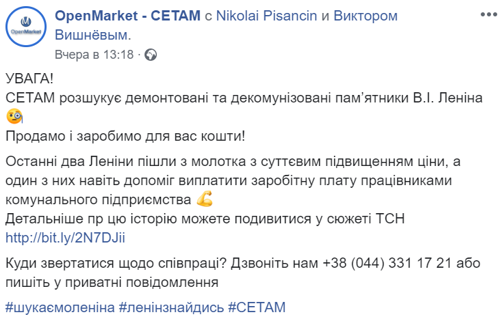 Представители Системы электронных торгов арестованным имуществом (СЭТАМ) намерены начать торговать демонтированными памятниками советскому вождю Владимиру Ленину. Об этом говорится на фб-странице OpenMarket - CETAM в среду, 23 октября.