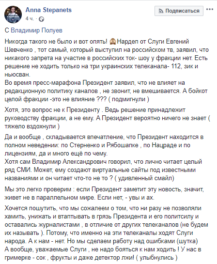 Народный депутат от Слуги народа Евгений Шевченко, который выступил на российском ТВ, заявил, что у фракции нет запрета на участие депутатов в российских ток-шоу, однако им запрещено ходить на три украинских телеканала - 112 Украина, Newsone и Zik.
