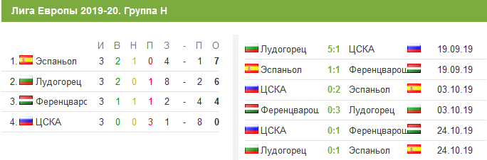Положение команд в группе Н после третьего тура Лиги Европы