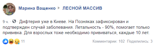 Марина Влащенко в сообществе "Лесной массив" пишет: "Дифтерия уже в Киеве. На Позняках зафиксирован и подтвержден случай заболевания. Летальность - 90%, помогает только прививка. Для взрослых тоже необходимо прививаться каждые 10 лет".
