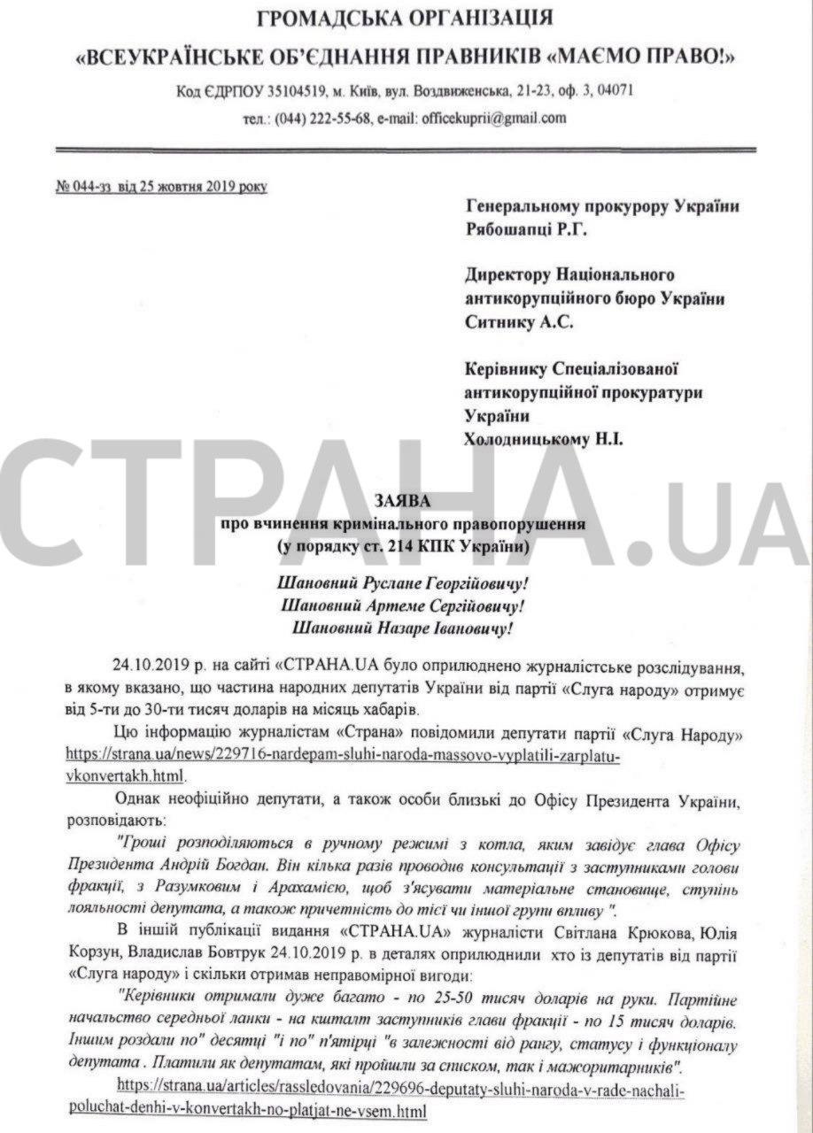 Заявление адресовано генеральному прокурору Украины Руслане Рябошапке, директору Национального антикоррупционного бюро Артему Сытнику и руководителю Специализированной антикоррупционной прокуратуры Назару Холодницкому.