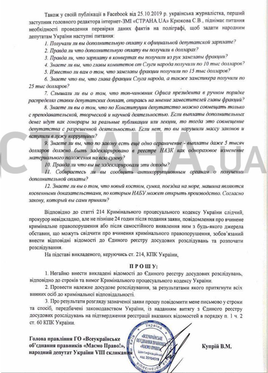 Председатель правления ОО "Всеукраинское объединение юристов "Имеем право!" и народный депутат Украины 8-го созыва Виталий Куприй написал заявление с требованием расследовать получение взяток и зарплат в конвертах нардепами фракции "Слуга народа", о котором писала "Страна".