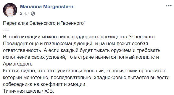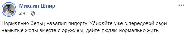 "Нормально Зельц навалил пидоргу. Убирайте уже с передовой свои немытые жопы вместе с оружием, дайте людям нормально жить", - пишет блогер Михаил Шпир.