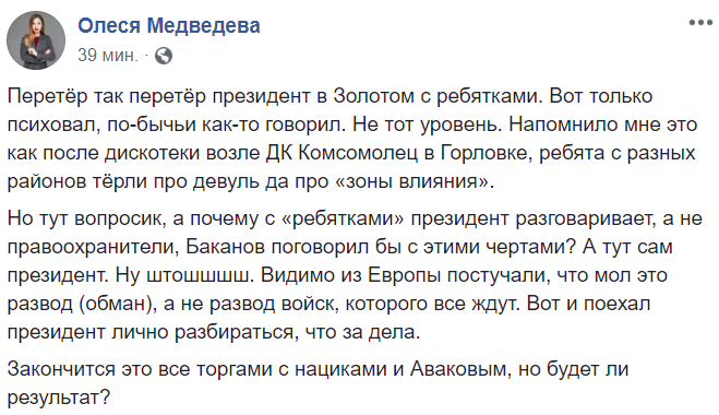 "Перетёр так перетёр президент в Золотом с ребятками. Вот только психовал, по-бычьи как-то говорил. Не тот уровень. Напомнило мне это как после дискотеки возле ДК Комсомолец в Горловке, ребята с разных районов тёрли про девуль да про "зоны влияния".