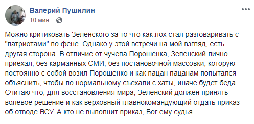 "Можно критиковать Зеленского за то что как лох стал разговаривать с "патриотами" по фене. Однако у этой встречи на мой взгляд, есть другая сторона. В отличие от чучела Порошенка, Зеленский лично приехал, без карманных СМИ, без постановочной массовки, которую постоянно с собой возил Порошенко и как пацан пацанам попытался объяснить, чтобы по нормальному съехали с хаты, иначе будет беда. Считаю что, для восстановления мира, Зеленский должен принять волевое решение и как верховный главнокомандующий отдать приказ об отводе ВСУ. А кто не выполнит приказ, Бог ему судья..." - пишет блогер Валерий Пушилин.