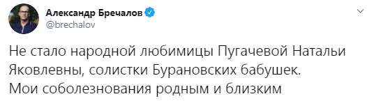 "Не стало народной любимицы Пугачевой Натальи Яковлевны, солистки Бурановских бабушек. Мои соболезнования родным и близким", - говорится в сообщении.