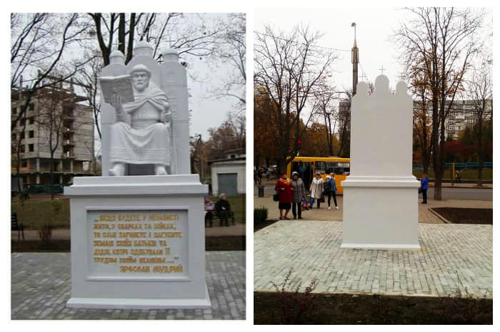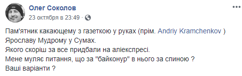 "Памятник какающему с газеткой в руках Ярославу Мудрому в Сумах.Которого скорее всего приобрели на алиэкспрессе. Меня мозолит вопрос, что за "Байконур" у него за спиной?" - писал Олег Соколов.