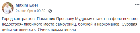 "Город контрастов. Памятник Ярославу Мудрому ставят на фоне вечного недостроя- любимого места самоубийц, бомжей и наркоманов. Суровая действительность. Очень показательно", - добавил в сети Maxim Edel.